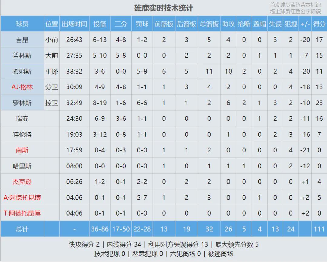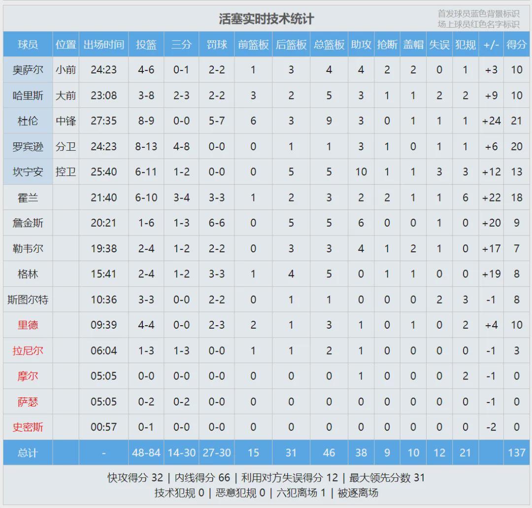 今天四节比分如下(雄鹿在前):28-34、29-41、29-37、25-25。坎宁安首发出战25分40秒,11投6中拿到13分5篮板10助攻1抢断1盖帽3失误,正负值+12。坎宁安毕竟三个星期没打比赛了,还需要一点时间找到之前的状态。